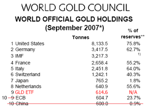 Gold has either been money or paper money has been fixed to gold for most of the last 200 years which should help explain why its price hasn't gone up during most of that time (neither did inflation). And if you believe what the government tells you about inflation, then you should certainly buy their "inflation protected" treasuries - good luck with staying ahead of rising prices in the real world. The "no-yield" and "cost to carry" issues are tough ones for most investors to grapple with after a 20-year bull market in stocks, but another year or two of 20+ percent gains in the POG will probably cure that. Netherlands, you're making it too easy The World Gold Council released new reserve statistics earlier in the week. The last time this was reviewed here, the chart below was prepared to show how the streetTRACKS Gold Shares ETF (NYSE:GLD) would be moving up in the rankings if it were eligible for inclusion.